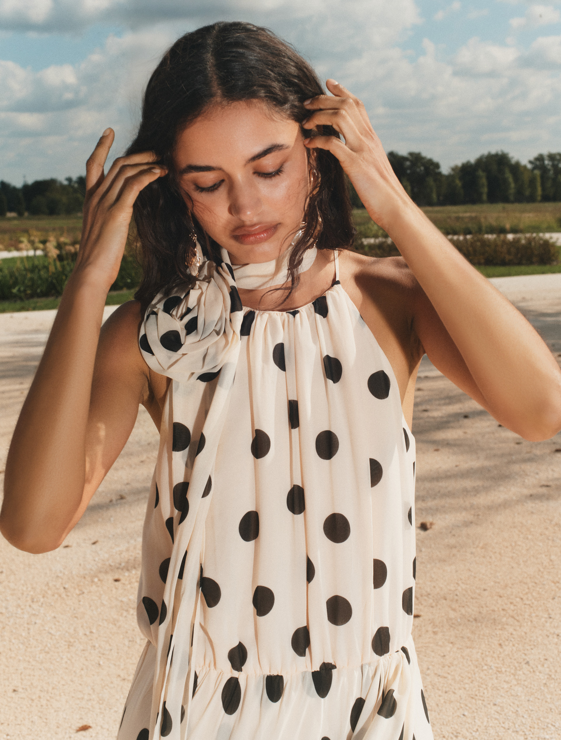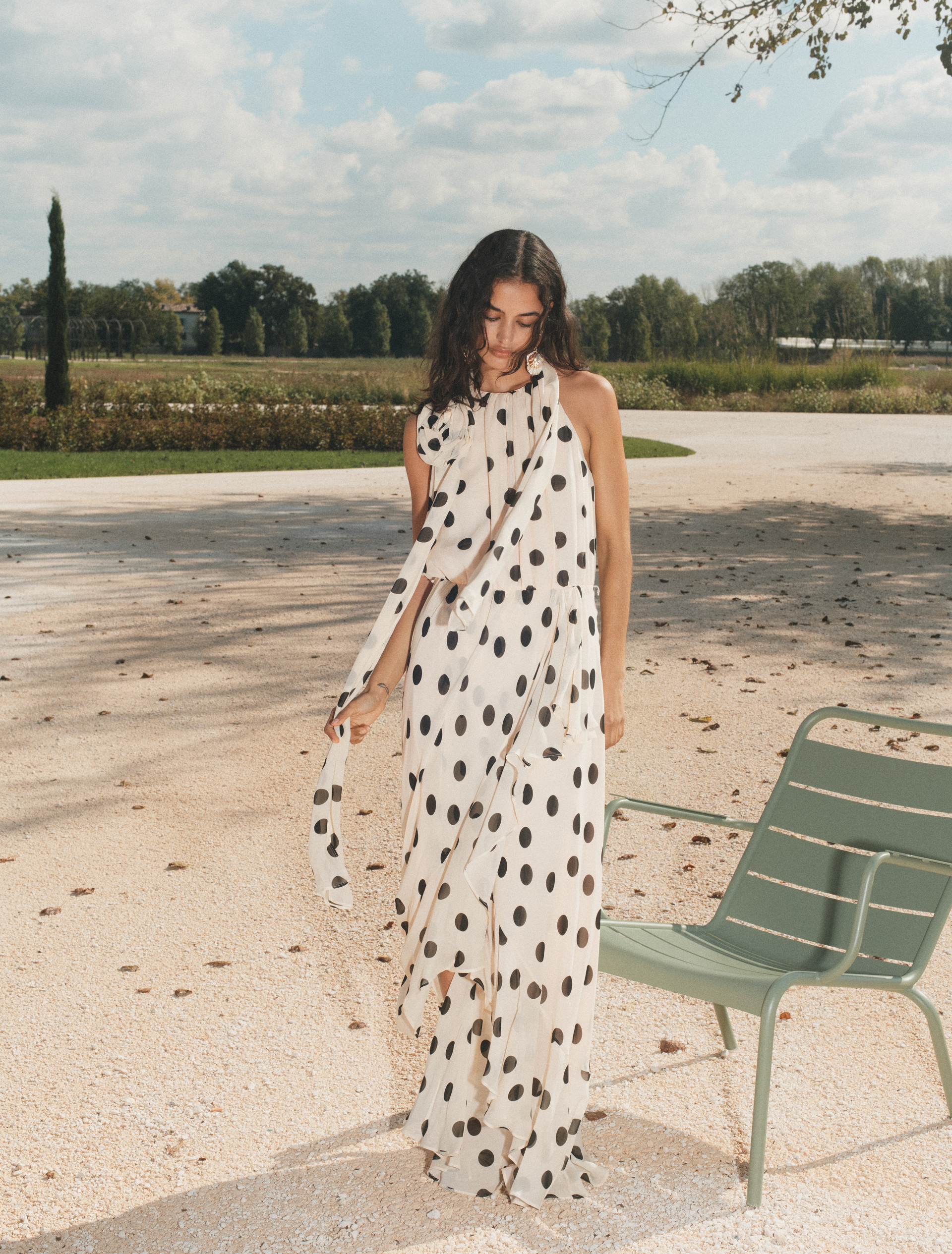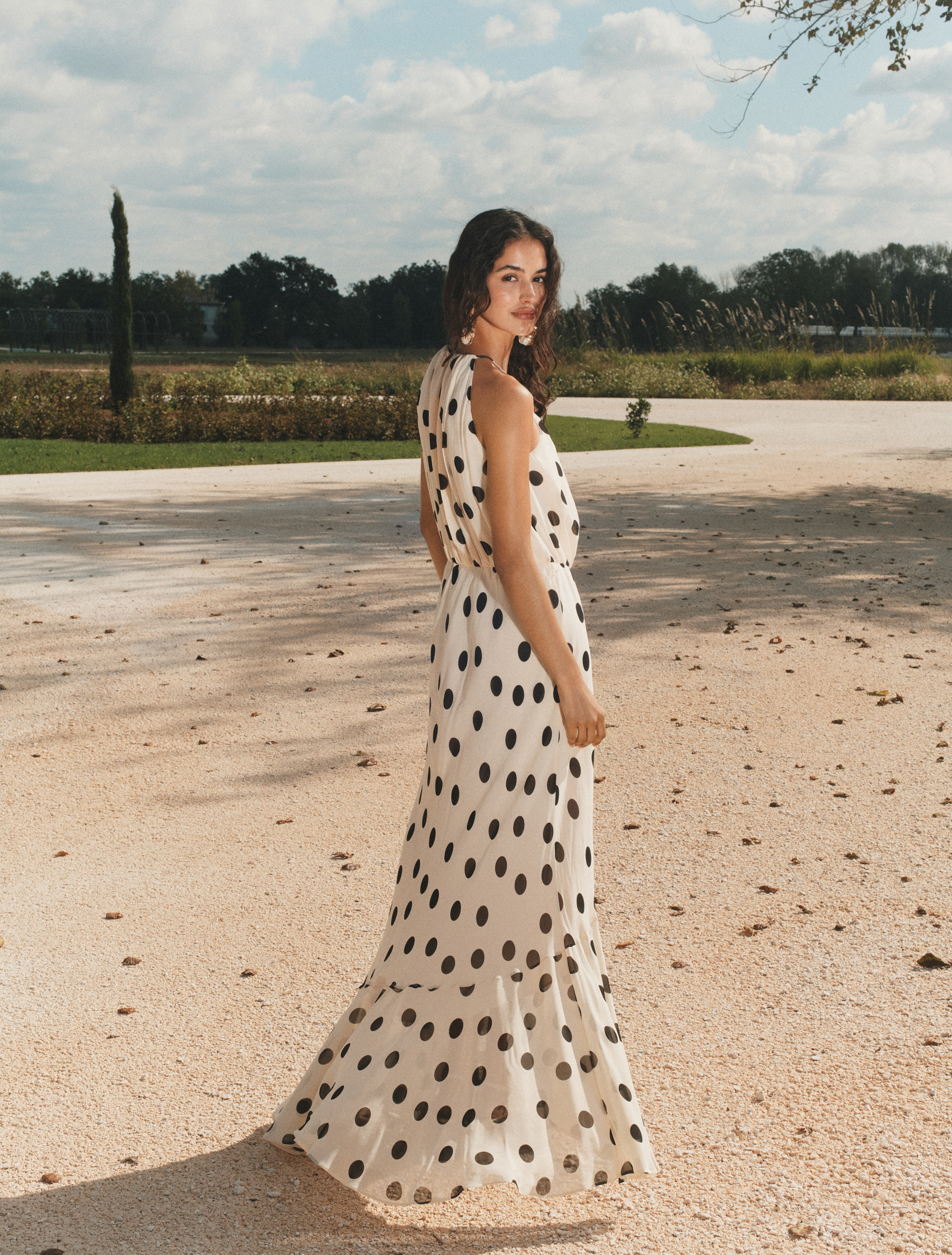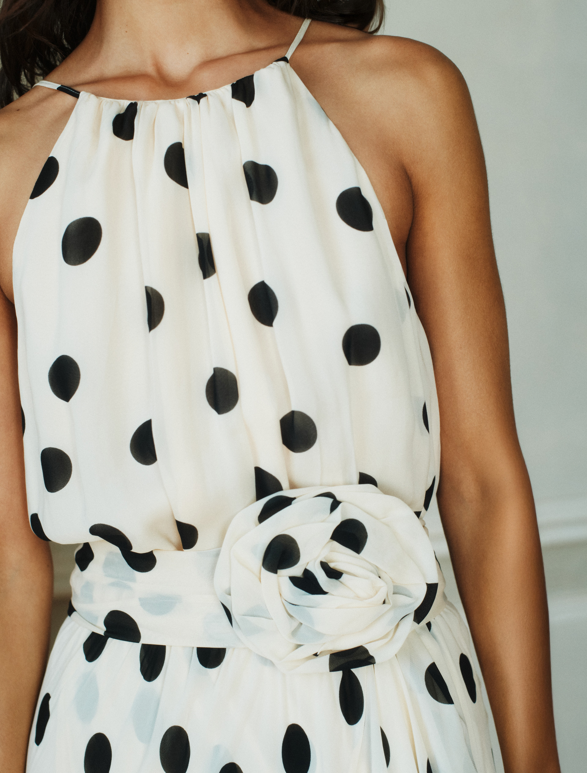 - Odcięcie w talii z elastyczną wstawką i ukośną maxi falbaną na spódnicy