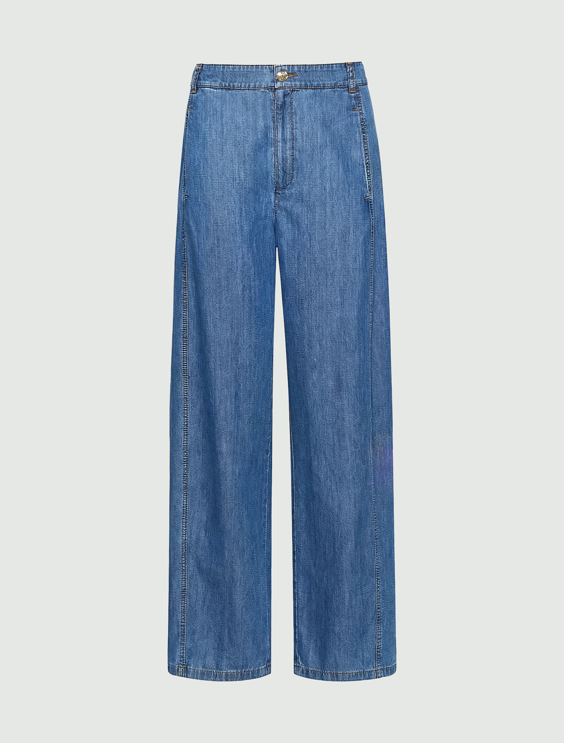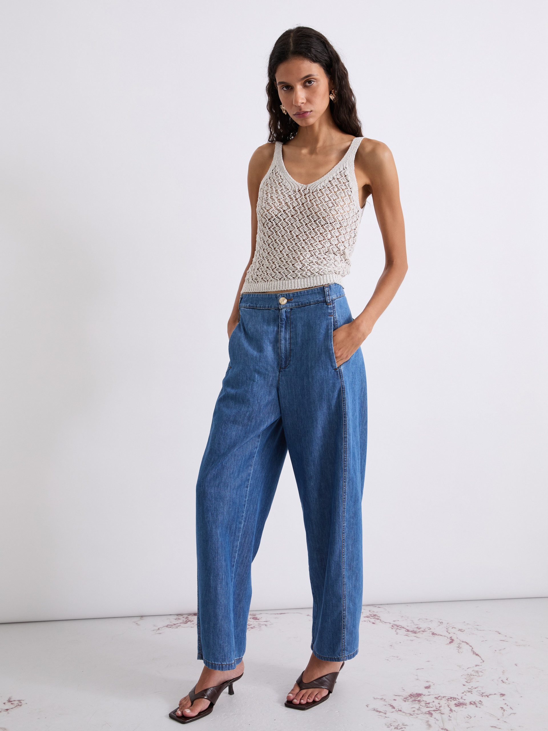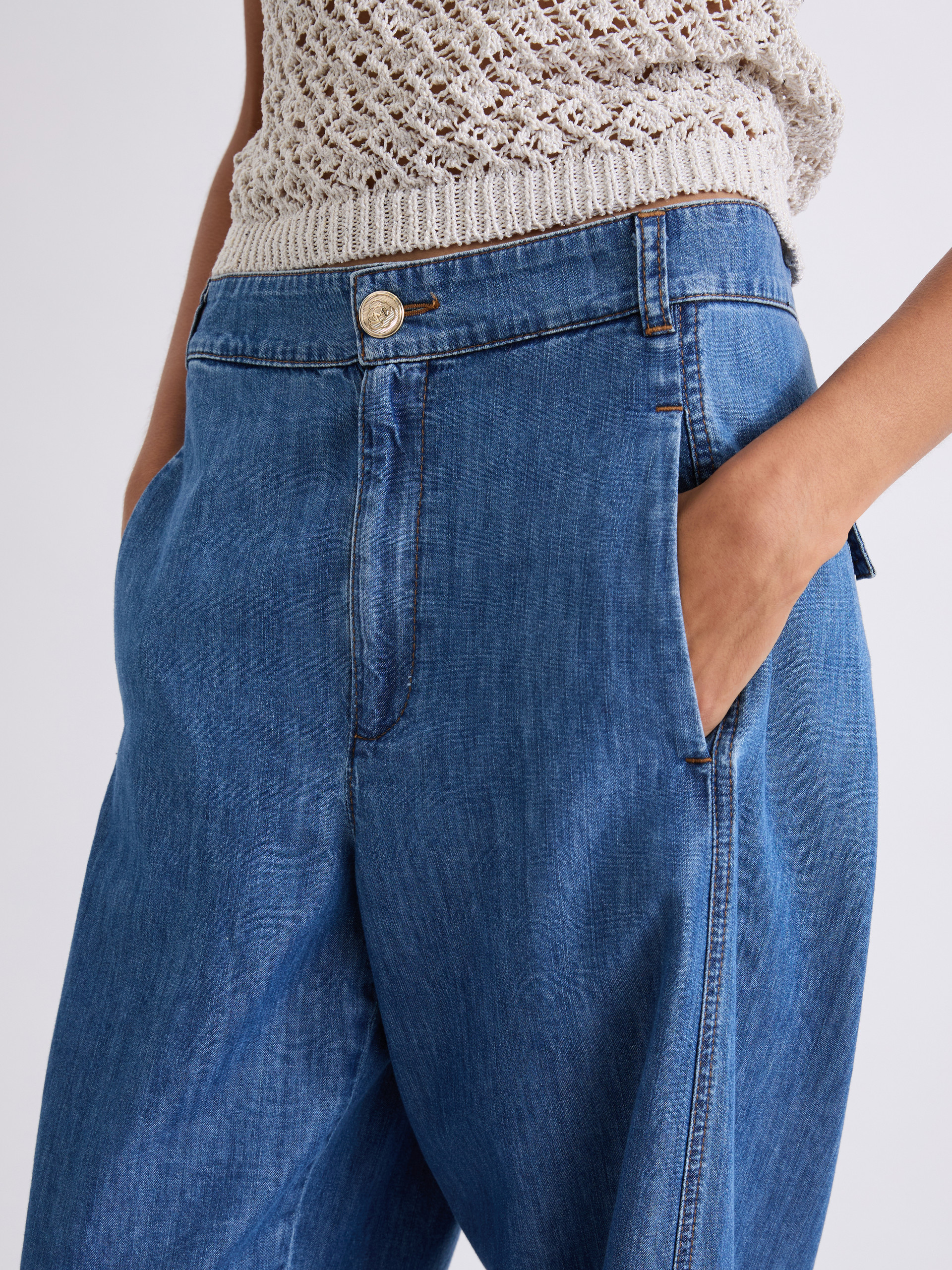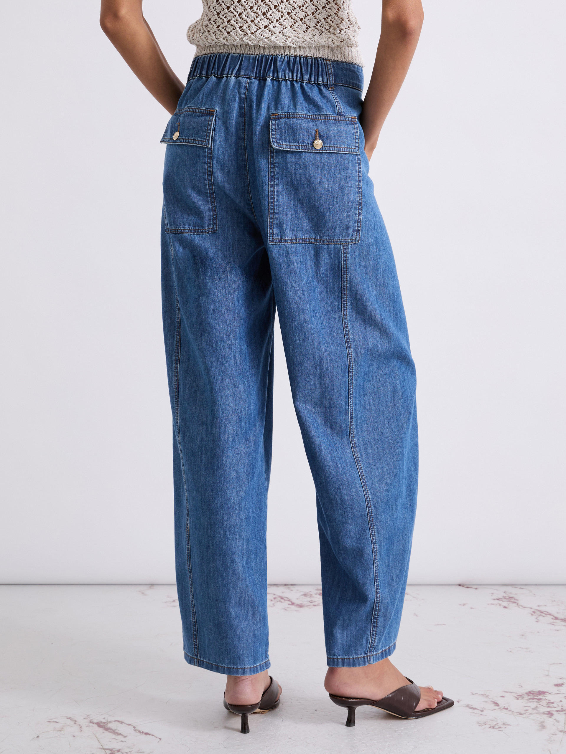 Dżinsy z cienkiego denimu z włóknem lyocell, dodającym tkaninie płynności. Linia barrel podkreśla aktualność konstrukcji, która została dodatkowo zaakcentowana gumą z tyłu w talii.